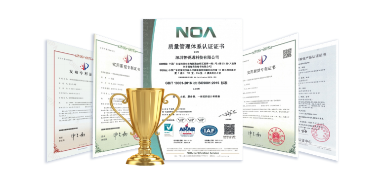 智锐通获得CCC、ISO9001、ISO14001、QC08000质量体系认证,ISO13485医疗器械体系认证,OHSAS18001、国军标GJB9001C-2017等多项体系认证